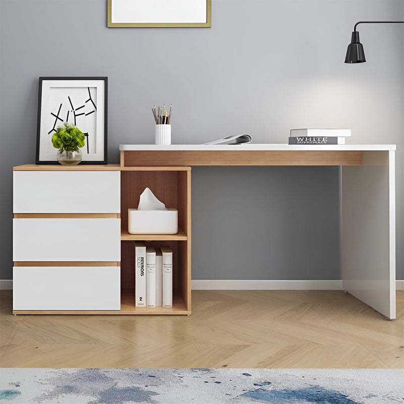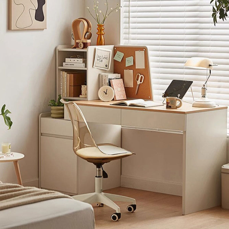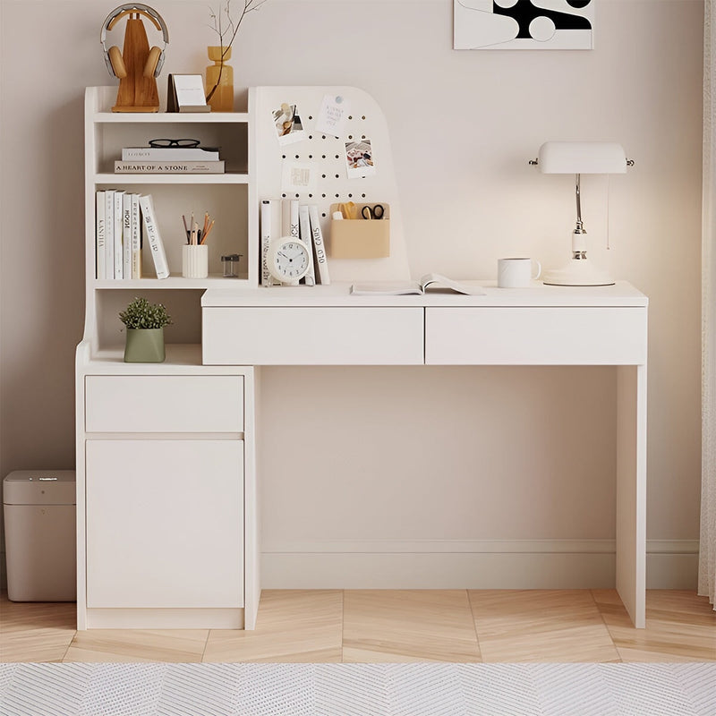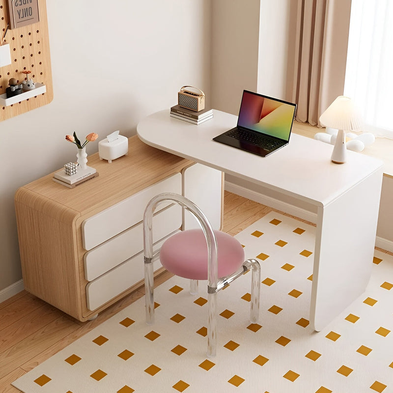 - 面取り加工 柔らかな印象 広い天板 ゆとり 引き出し 太い脚 補強フレーム 安定性 デスク パソコンデスク 作業用 シック 洗練 簡素 ホワイト DESK-K009
