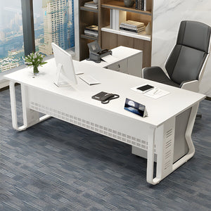 - エグゼクティブデスク 役員用デスク オフィスデスク ワークデスク 配線孔 幕板 サイドキャビネット 鍵付き 引き出し スチールフレーム ホワイト LBZ-K028