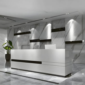 - 鏡面仕上げ おしゃれ バイカラー 上部天板付き プライバシー配慮 幅広 ゆとり 引き出し カウンター レジカウンター 受付カウンター スッキリ ホワイト カスタマイズ可能 JDT-K-053