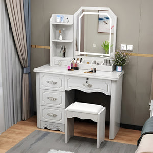 - LEDライト 3段階調光 鏡 引き出し 収納ラック 錠付き 収納ボックス 1台2役 ドレッサー デスク 化粧台 機能的 上品 エレガント ホワイト HZT-K037
