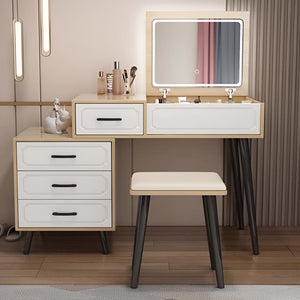 - 開閉式ミラー LEDライト 3段階調光 引き出し 仕切り 大容量 分類収納 エコ板材 ドレッサー デスク 化粧台 鏡台 洗練 機能的 モダン ホワイト ナチュラル HZT-K038