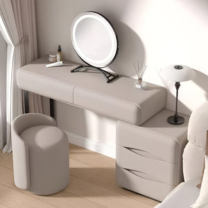 - 革張り R仕上げ 天然木 引き出し 大容量 分類収納 ミラー LEDライト 3段階調光 伸縮可能 巾木よけ ドレッサー デスク 化粧台 モダン エレガント 機能的 ホワイト グレー HZT-K040