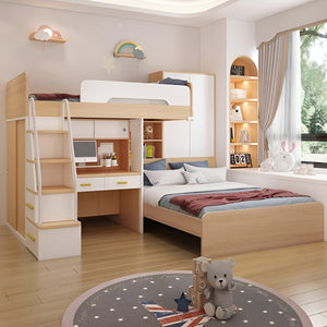 - 跳ね上げ収納 収納棚 引き出し 分類収納 デスク 手摺り付き階段 エコ板材 頑丈 耐久性 2段ベッド ロフトベッド 機能的 木目調 ナチュラル ホワイト SCC-K047