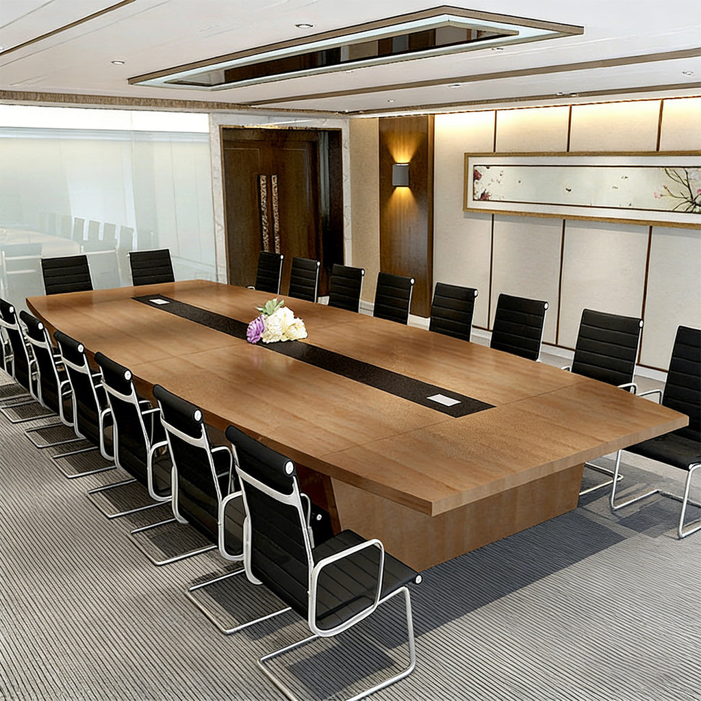 - 分厚い天板 配線ボックス 幅広 舟型天板 台形脚 安定性 会議テーブル ミーティングテーブル テーブル 木目調 自然な風合い 洗練 シンプル カスタマイズ可能 HYZ-C041
