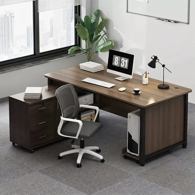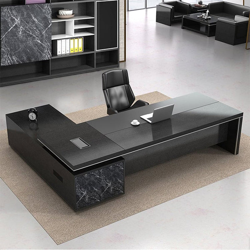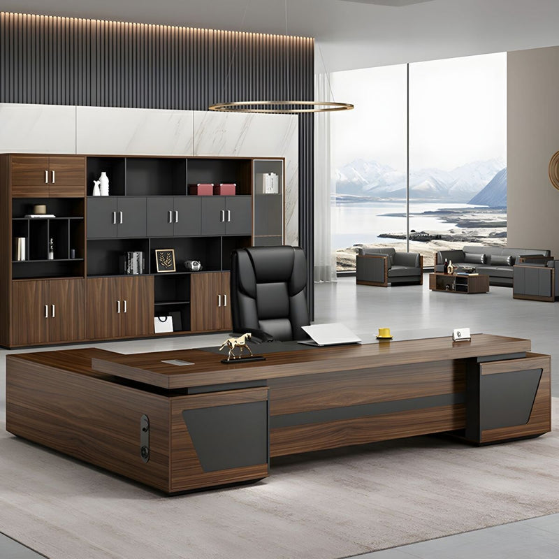 ワークデスク オフィスデスク 重役デスク L字デスク 木目調 大容量収納 キャビネット付き 幕板付き 鍵付き ブラック カスタマイズ可能 LBZ-M-082