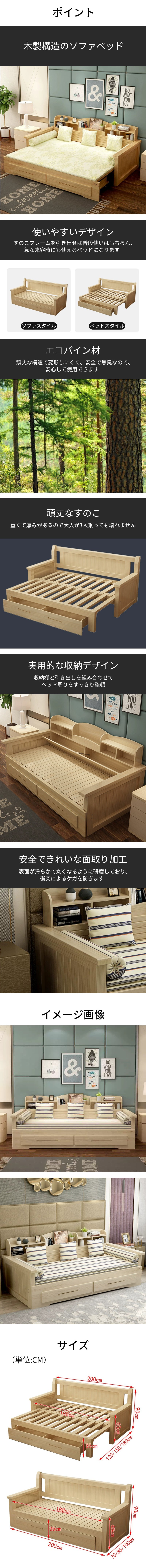 - 木製ソファベッド 伸長式ベッド すのこベッド ソファベッド 引き出し 収納棚 パイン材 すのこ ナチュラル 木質感 カスタマイズ可能 ZDC-K030