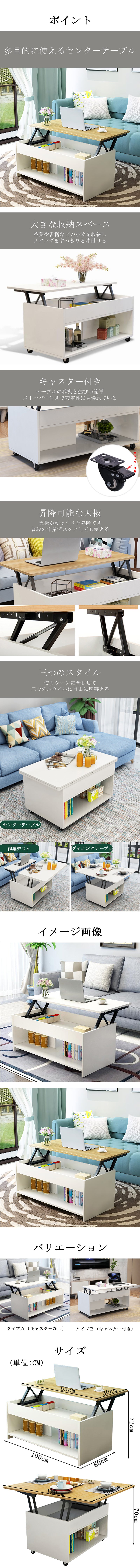 - テーブル センターテーブル ダイニングテーブル 作業デスク リビング用 昇降 収納 隠れ キャスター 多目的 使い勝手 実用的 CZ-K054