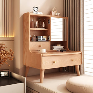 天然木 頑丈 鏡 回転 伸縮可能な天板 収納棚 扉付き収納 引き出し R仕上げ ドレッサー デスク 鏡台 化粧台 木目調 ナチュラル 落ち着き HZT-K042