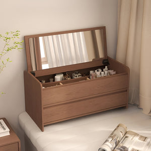 - 開閉式ミラー 鏡 引き出し 大容量 仕切り R仕上げ 天然木 頑丈 木目調 落ち着き ドレッサー 鏡台 デスク 機能的 コンパクト 実用 ウォールナット ホワイト HZT-K043