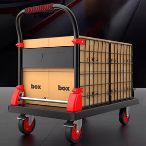 - 大容量 折りたたみ 取り外し可能な柵 キャスター ストッパー付き 底板 頑丈 引き手 クッション付き 台車 カゴ付き台車 荷車 使い勝手 機能的 実用 ブラック WLC-K004